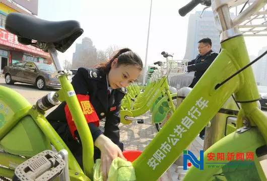 2016年3月1日,安陽市高新區(qū)七仙女轉(zhuǎn)盤公共自行車租賃站點(diǎn),高新區(qū)國稅局的青年志愿者正在為20輛綠色環(huán)保的公共自行車進(jìn)行保潔。