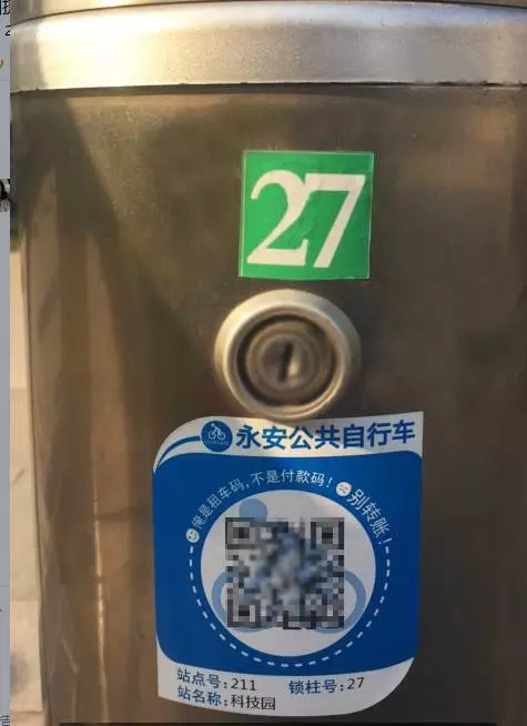 5、路人君在距離自己最近的一個(gè)站點(diǎn)上,發(fā)現(xiàn)每一個(gè)停車(chē)樁上都貼上了一個(gè)二維碼。