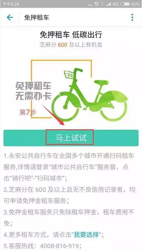 7、果然,芝麻分在600分及以上才可以使用。點(diǎn)擊“馬上試試”,下面就正式進(jìn)入租車(chē)的步驟啦!