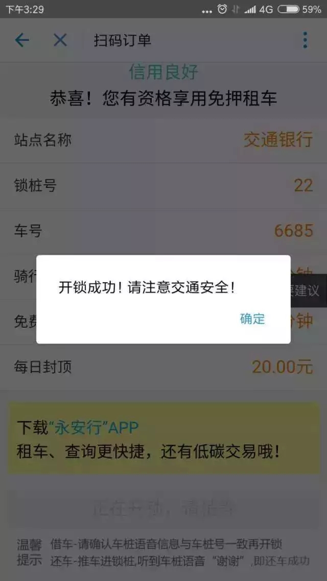 9、填寫(xiě)好支付密碼后,跳轉(zhuǎn)的界面上,我們可以看到上面有站點(diǎn)名稱(chēng)、鎖樁號(hào)、車(chē)號(hào)、騎行單價(jià)、免費(fèi)時(shí)段以及每日封頂。