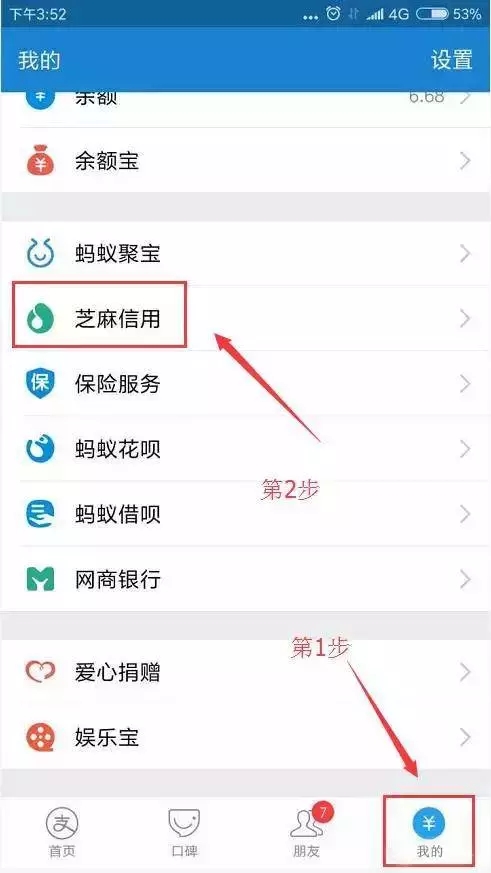 1、打開(kāi)支付寶,點(diǎn)擊右下角“我的”菜單欄,然后點(diǎn)擊“芝麻信用”,查看自己的信用積分;