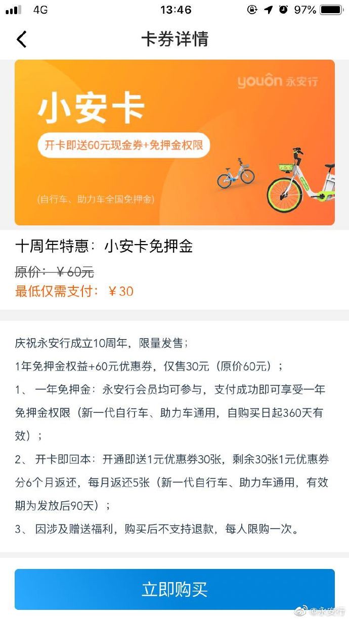 買30元小安卡贈送60元現(xiàn)金券(原價60元)打開永安行app-商城-出行福利進行購買#因為永安 出行簡單#