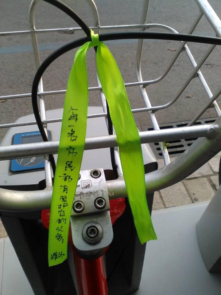 當(dāng)天上午8時許,記者來到東風(fēng)西街與向陽路交叉口以西路南的公共自行車站點(diǎn),十幾輛公共自行車的車筐位置都綁上了綠絲帶,上面寫著“請自覺愛護(hù)自行車”、“自行車也怕疼”等話語,另外還有微笑、哭泣等表情符號,仿佛是公共自行車在跟人對話。記者走訪了周邊的幾個公共自行車站點(diǎn)看到,每個站點(diǎn)都有綁綠絲帶的公共自行車。